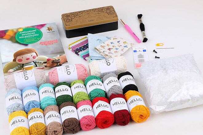"Amigurumi Arkadaşlar" kitabı ve kitaptaki birbirinden güzel oyuncaklarını örmek için gereken malzemeler mevcuttur. Bu seti aldığınızda dışarıdan hiçbir malzemeye gereksinim duymadan, sadece setin içerisinde yer alan malzemeleri kullanarak amigurumi yapabilirsiniz. Sette yer alan iplik miktarı ile kitapta yer alan modellerin bir kısmı rahatlıkla örülebilir.